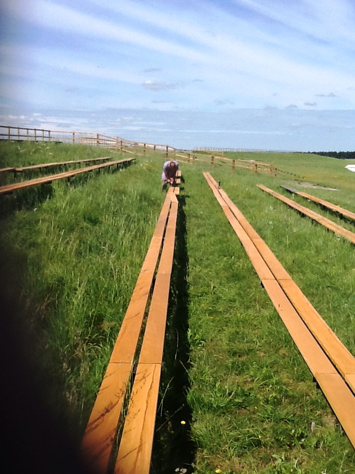 Back in March 2014, we set about cutting the grass which had been uncut for a number of years. We re-fenced the rear of the seating/grandstand area with 400m new post and rail, replaced and repaired the concrete steps and installed a new access track. The final job was to replace 3000 linear metres of hardwood timber seating (see picture), which involved removing the old, sourcing replacements, painting and repairing all steel supports and then fixing new boards.