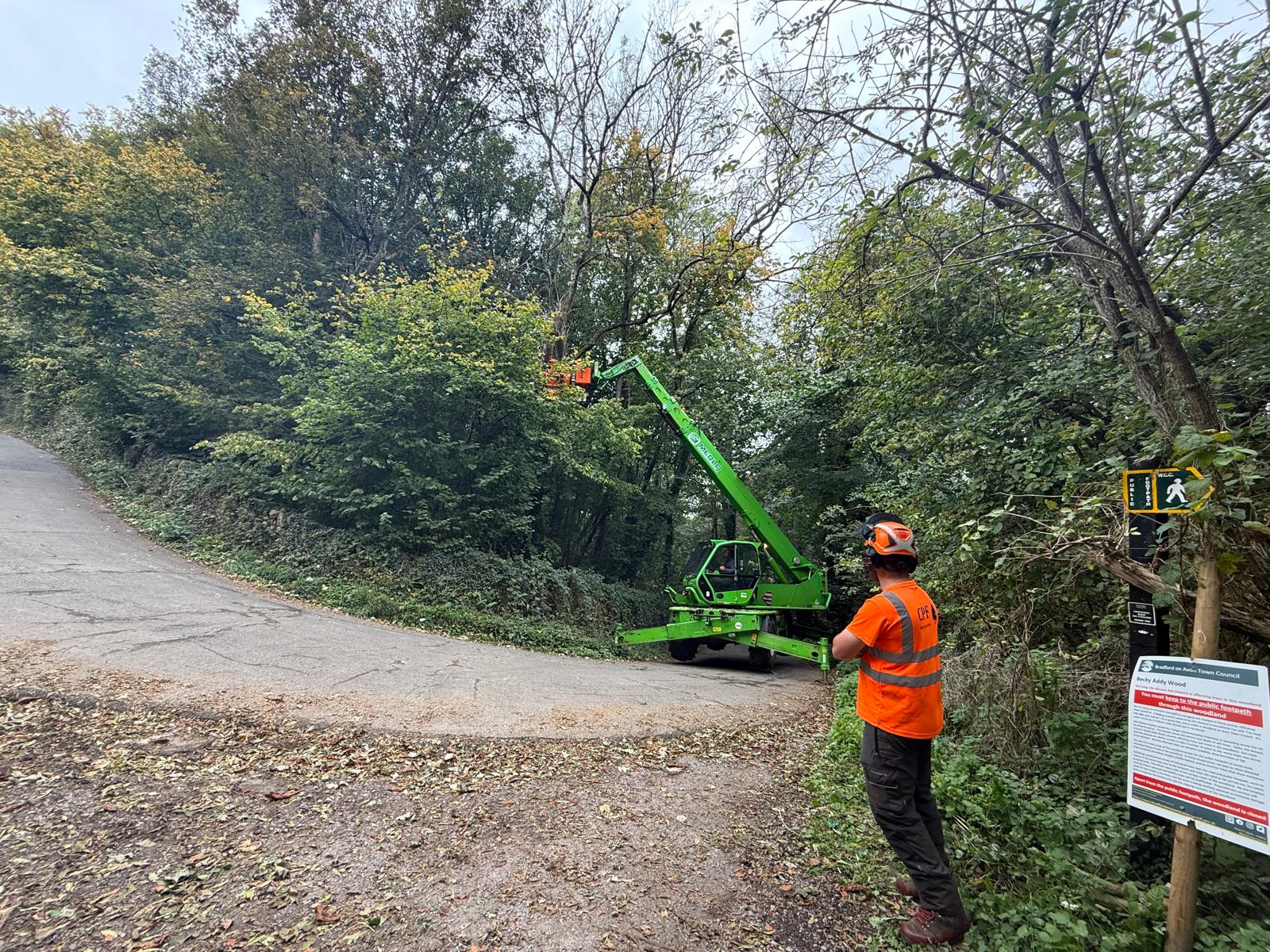 A tricky project to remove 30 dangerous ash trees from a roadside woodland in Avoncliff along a steep, single-track road, with limited spacing and having to set up machinery on an incline. However, the Merlo makes the operation safe and efficient – it is fitted with a grapple saw, has extra-long reach and is better when working on a road as it has tyres and not track.